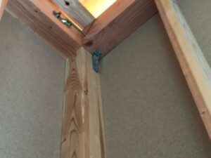 外壁面に貼っている耐力面材の他、床合板や室内の柱も丁寧に施工していました。