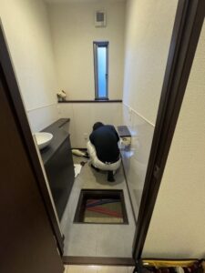 既存のトイレを撤去した後、床貼替え→トイレ設置