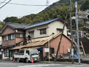 古い瓦、野地板(バシ板)、土を撤去し、新しい垂木と野地板を施工していきます。